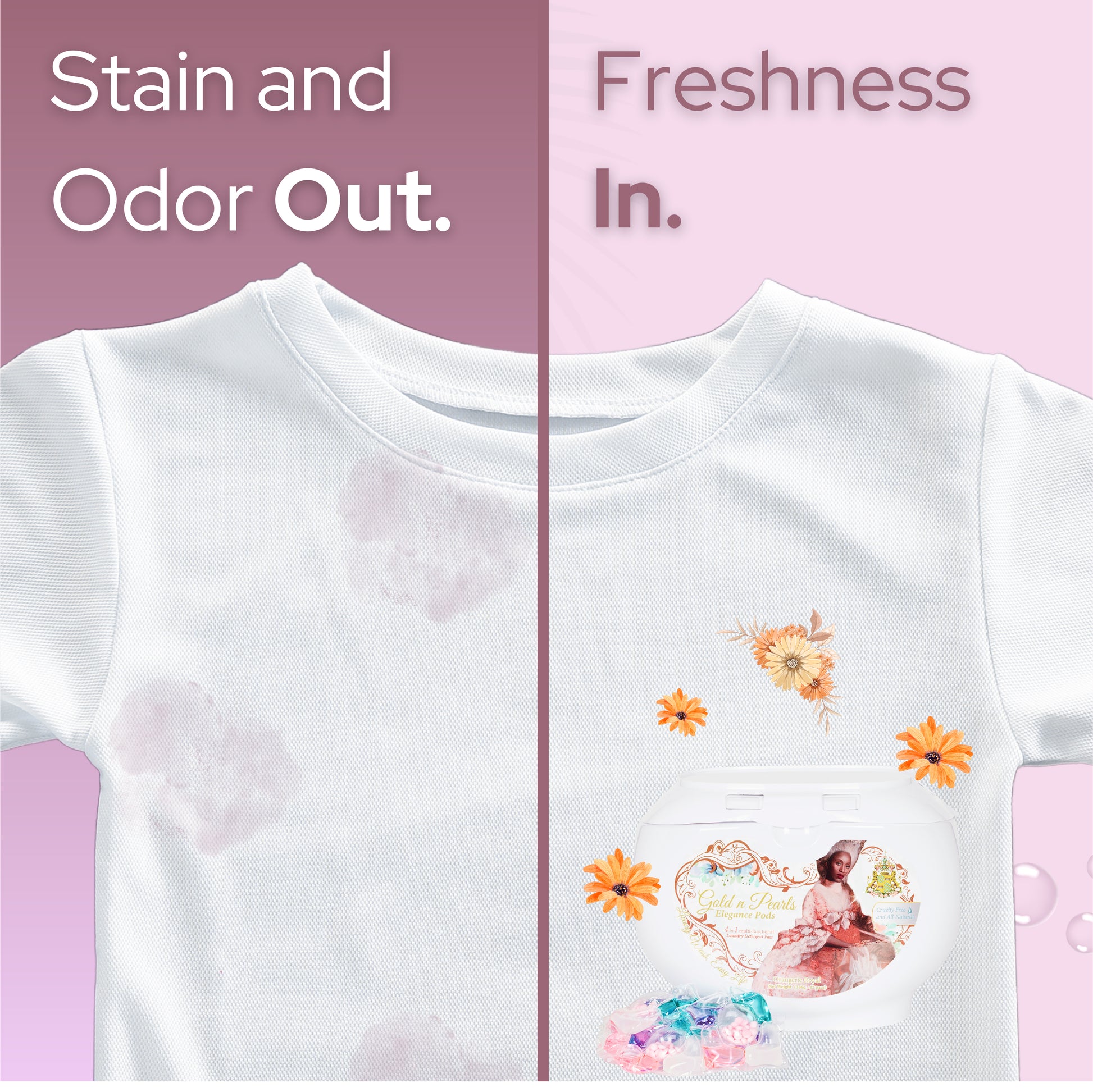Gold n Pearls 5-in-1 Laundry Pods in Orangerie Royal deliver a seamless blend of performance and luxury. Each pre-measured pod offers five essential benefits - deep cleaning, softening, refreshing, stain removal, and fabric care - in one graceful motion. No mess. No waste. Just refined simplicity.